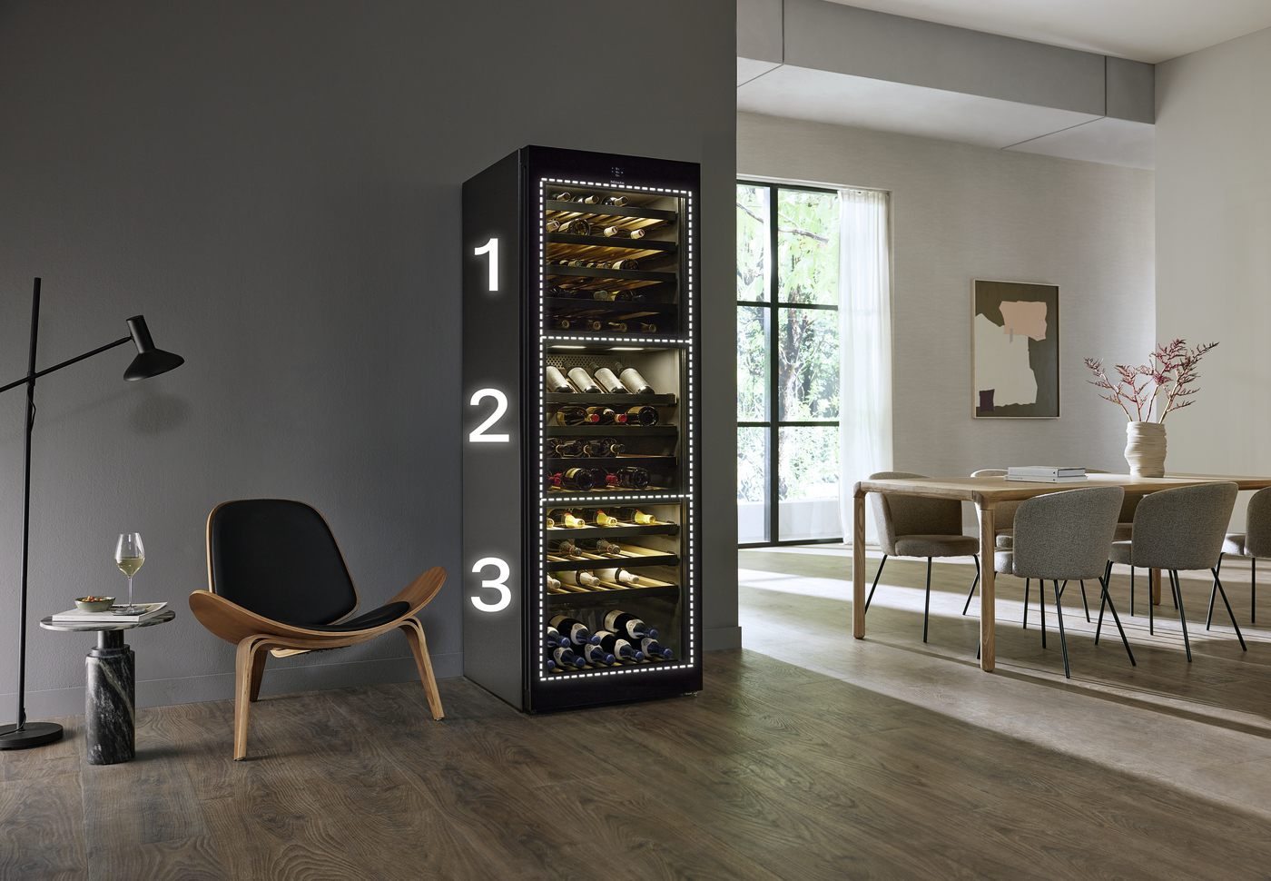 Up to three different types of wine requiring different temperatures can be stored at the same time.